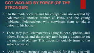 Plato Republic Book 1 1. Thrasymachus claims that justice is the advantage of the stronger.